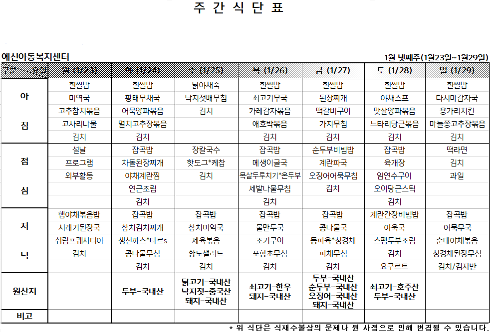 | 2023년 1월 첫째주 주간식단표 (0) | 2023.01.01 |