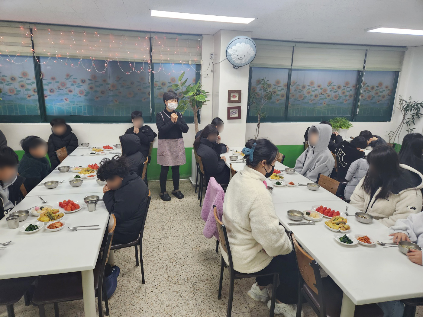식당에 모여 기도를 드리고,