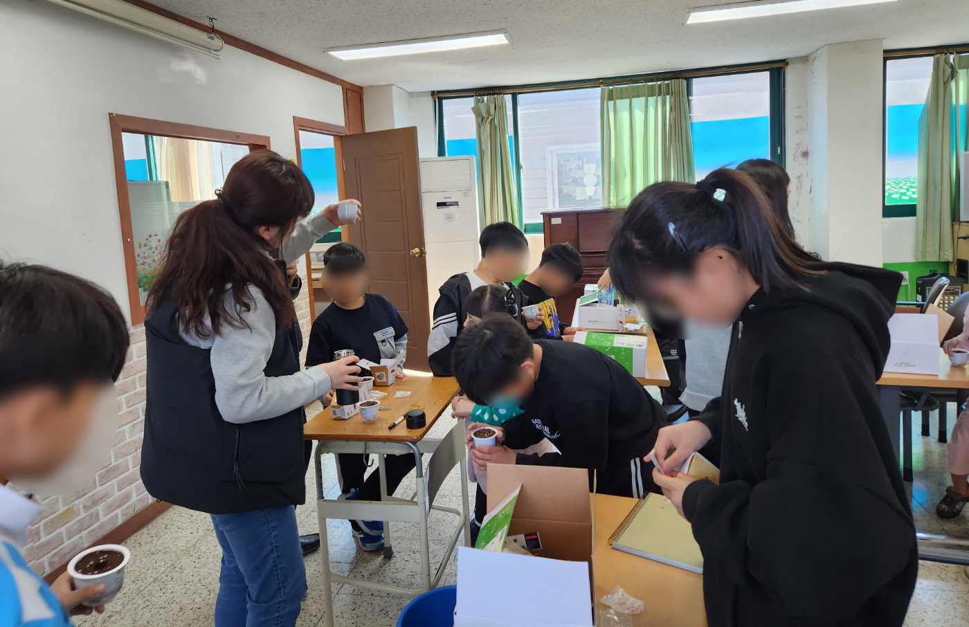 강당에 모여 토마토 키우기 프로그램을 진행했습니다.