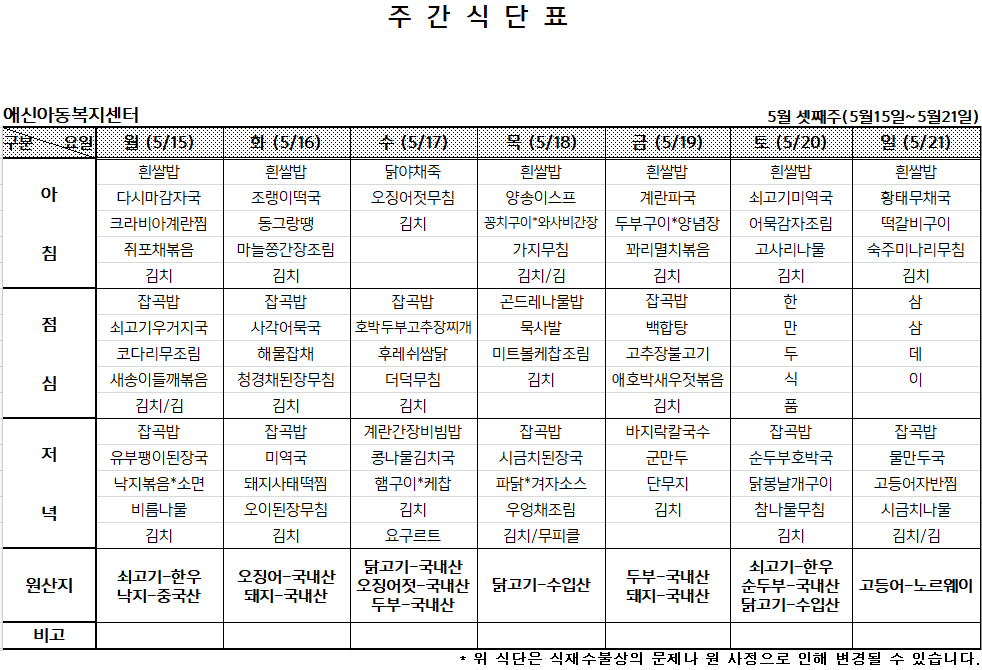 | 2023년 5월 첫째주 주간식단표 (0) | 2023.04.30 |