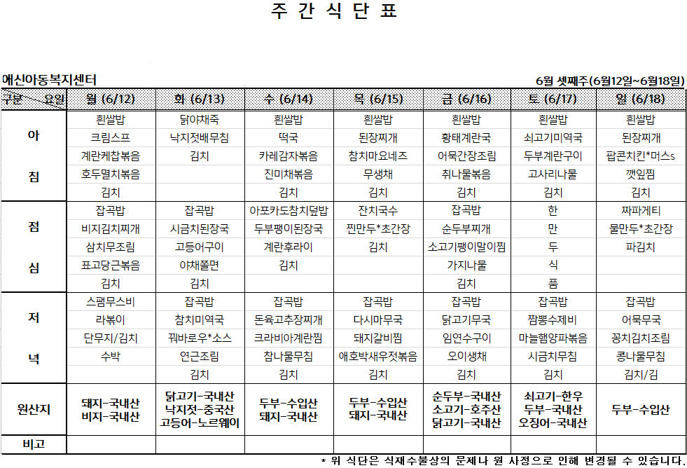 | 2023년 6월 둘째주 주간식단표 (0) | 2023.06.04 |