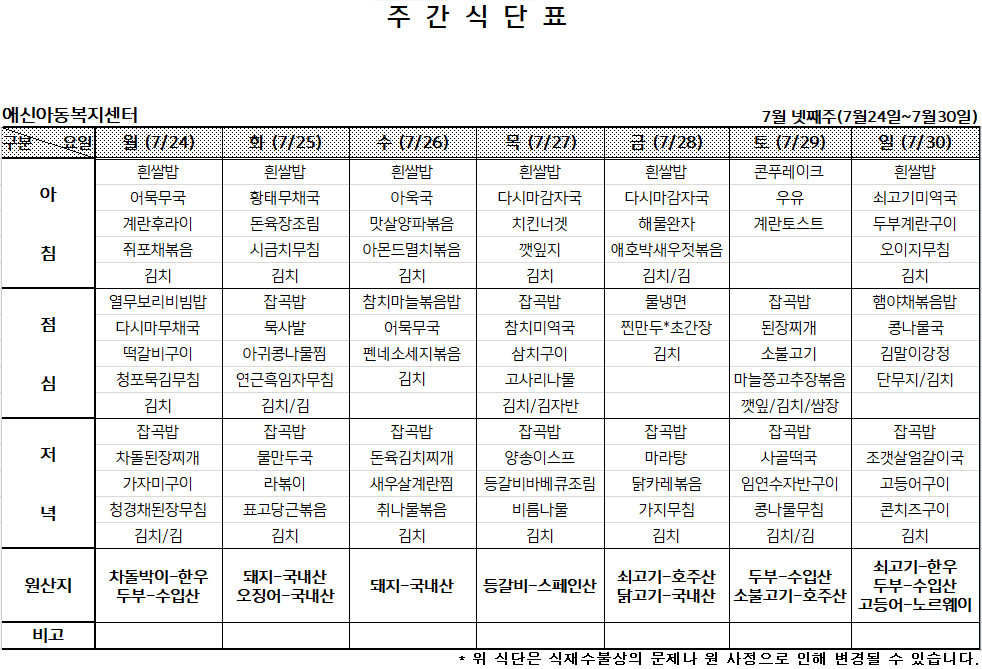 | 2023년 8월 첫째주 주간식단표 (0) | 2023.07.30 |