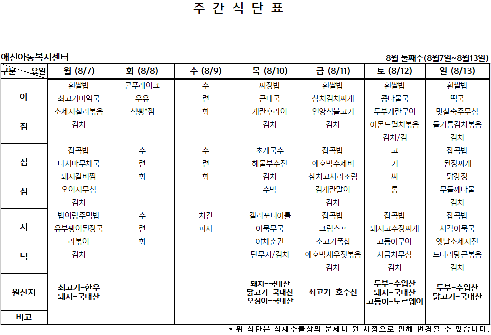 | 2023년 8월 첫째주 주간식단표 (0) | 2023.07.30 |