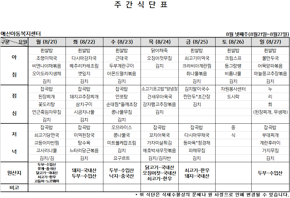 2023년 8월 넷째주 주간식단표