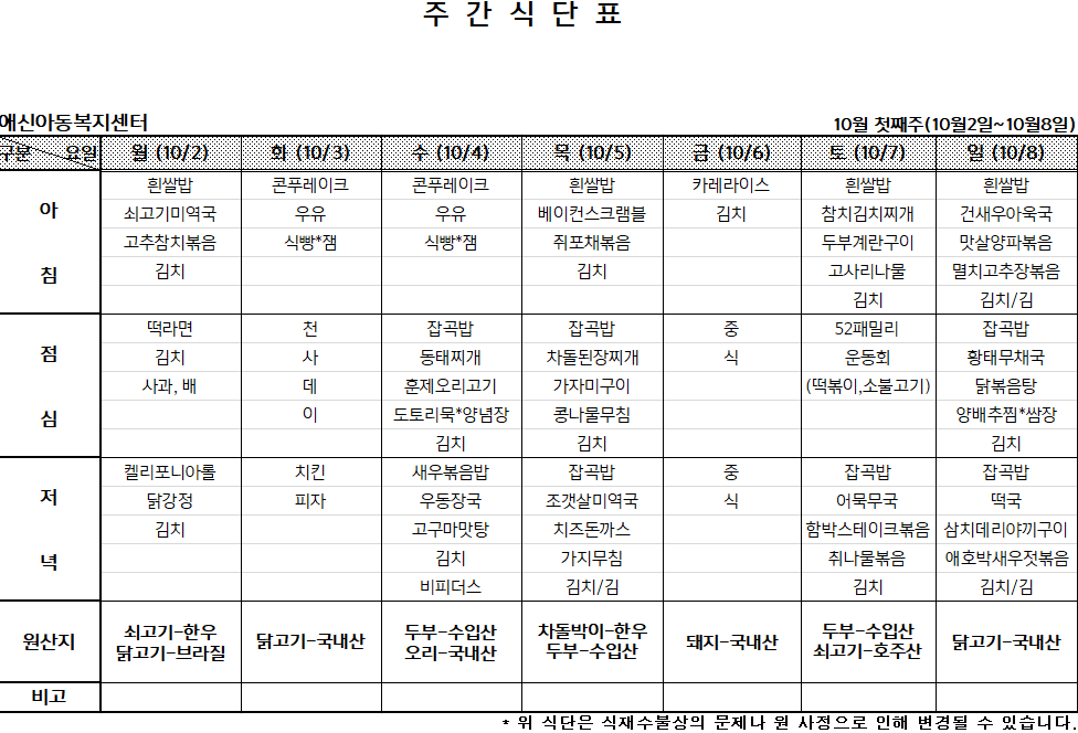 | 2023년 10월 둘째주 주간식단표 (0) | 2023.10.08 |
