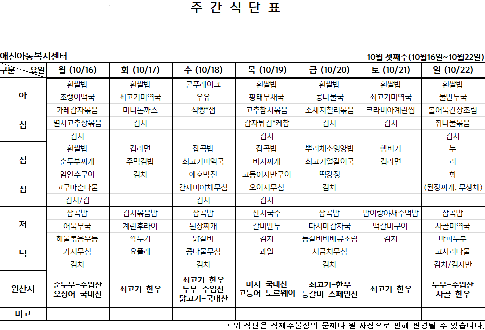 2023년 10월 셋째주 주간식단표
