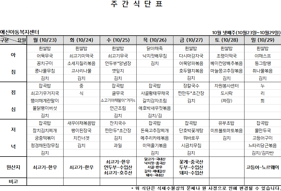 | 2023년 11월 첫째주 주간식단표 (0) | 2023.10.29 |