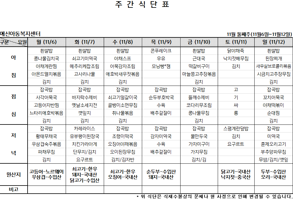 | 2023년 11월 첫째주 주간식단표 (0) | 2023.10.29 |