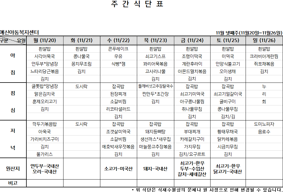 2023년 11월 넷째주 주간식단표