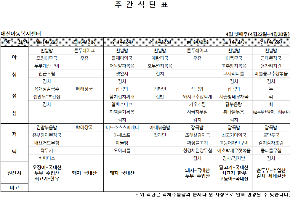 | 2024년 5월 첫째주 주간식단표 (0) | 2024.04.29 |