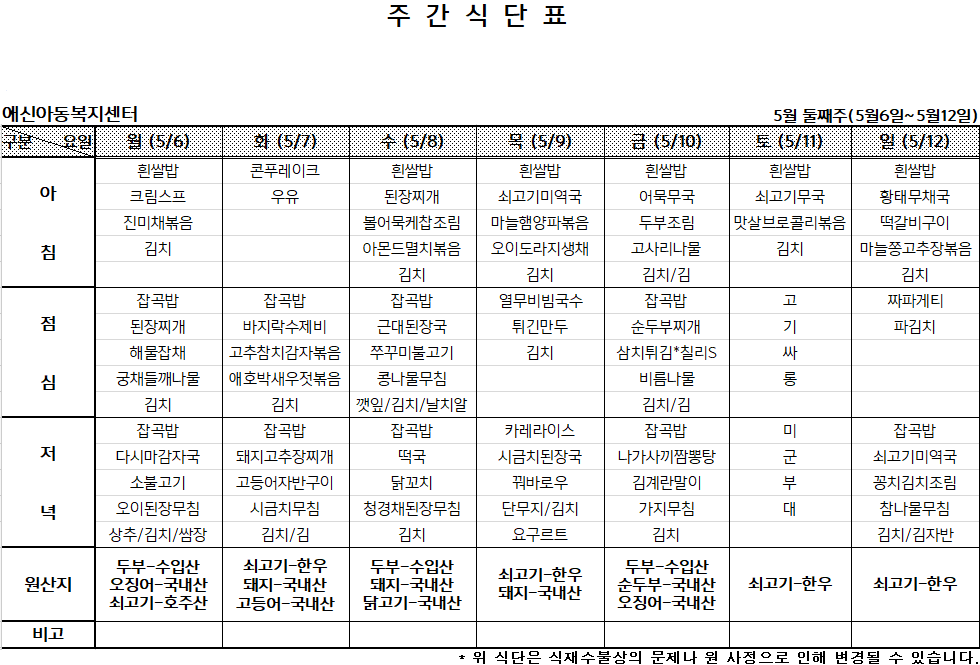 | 2024년 5월 첫째주 주간식단표 (0) | 2024.04.29 |