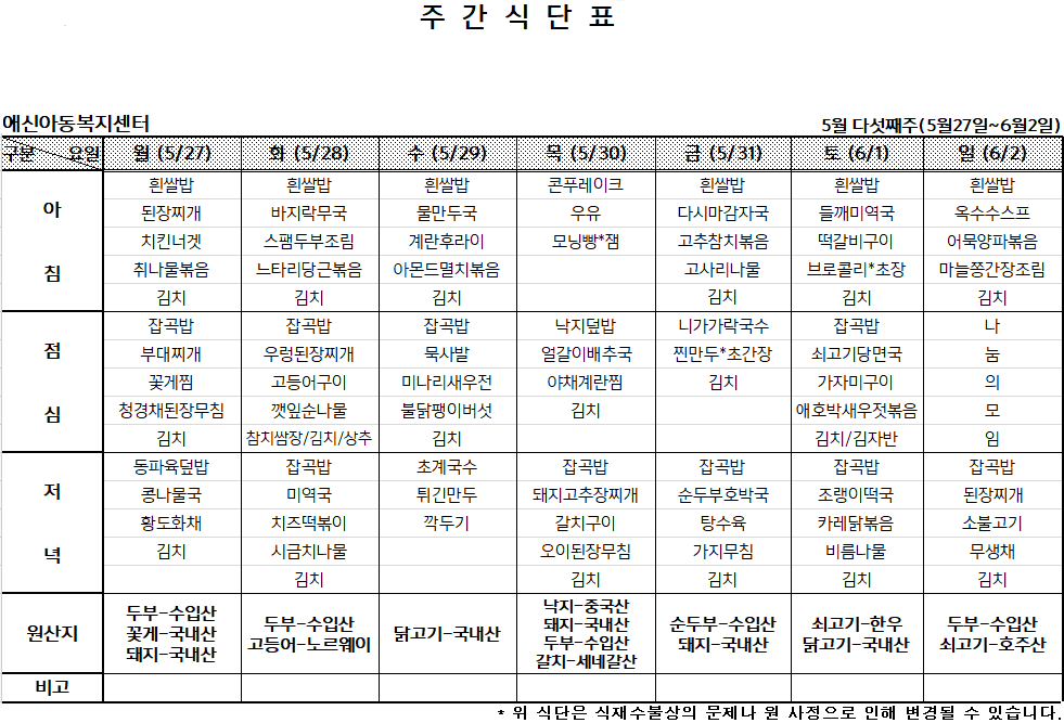 | 2024년 6월 첫째주 주간식단표 (0) | 2024.06.02 |
