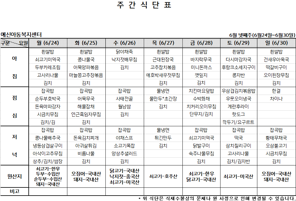 | 2024년 6월 둘째주 주간식단표 (0) | 2024.06.09 |