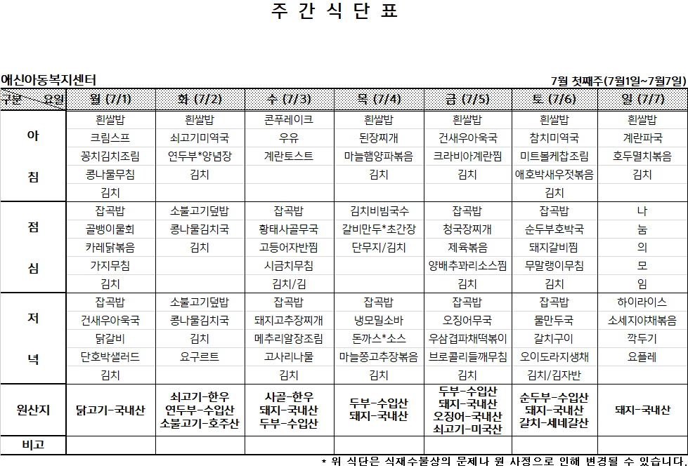 | 2024년 7월 둘째주 주간식단표 (0) | 2024.07.07 |