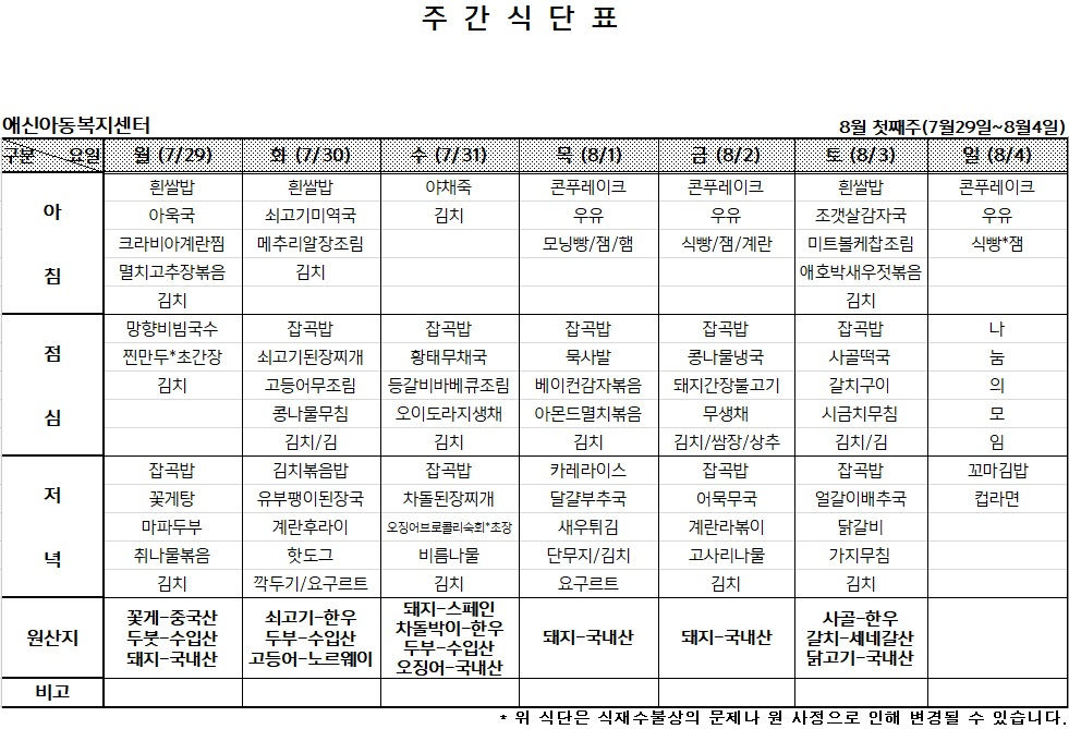| 2024년 8월 둘째주 주간식단표 (0) | 2024.08.04 |