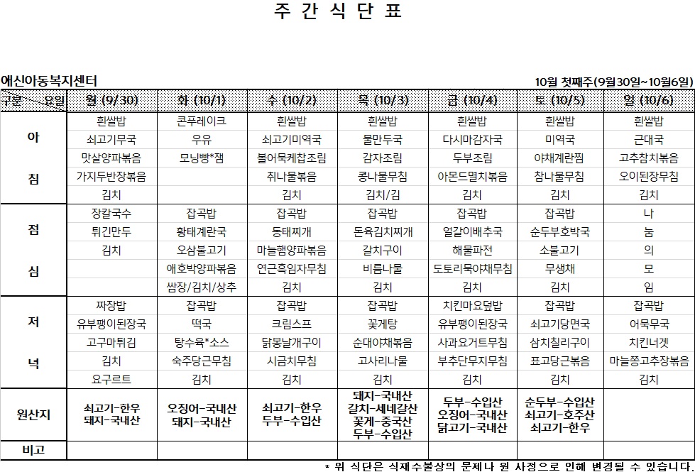 | 2024년 10월 둘째주 주간식단표 (0) | 2024.10.06 |
