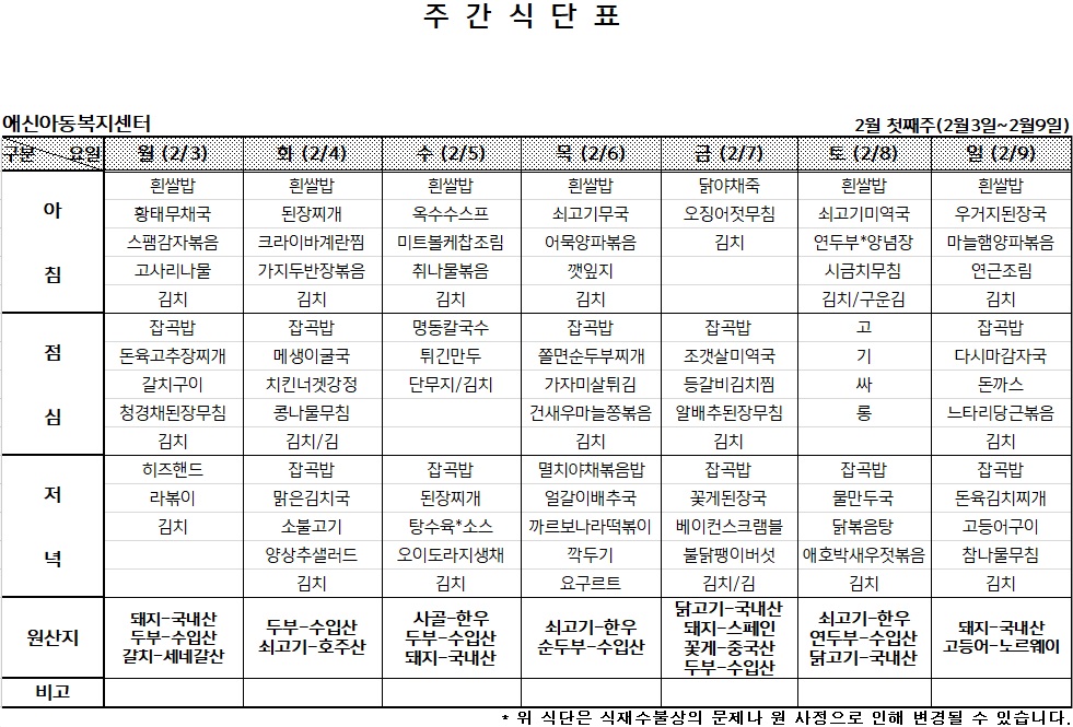 2025년 2월 첫째주 주간식단표