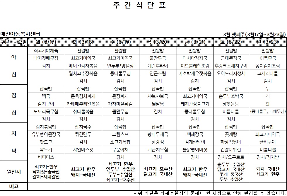 | 2025년 3월 둘째주 주간식단표 (0) | 2025.03.09 |