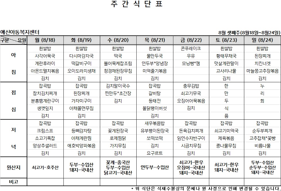 | 2025년 8월 첫째주 주간식단표 (0) | 2025.08.03 |