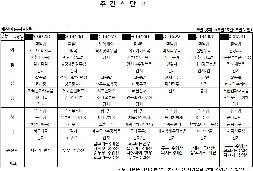 2025년 8월 넷째주 주간식단표