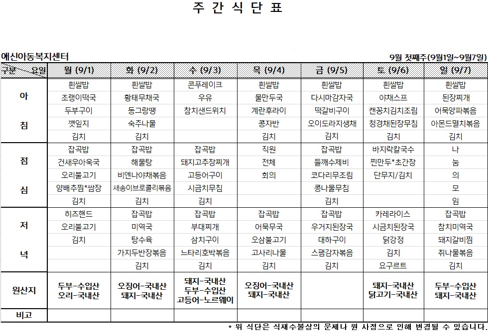 | 2025년 9월 둘째주 주간식단표 (0) | 2025.09.08 |