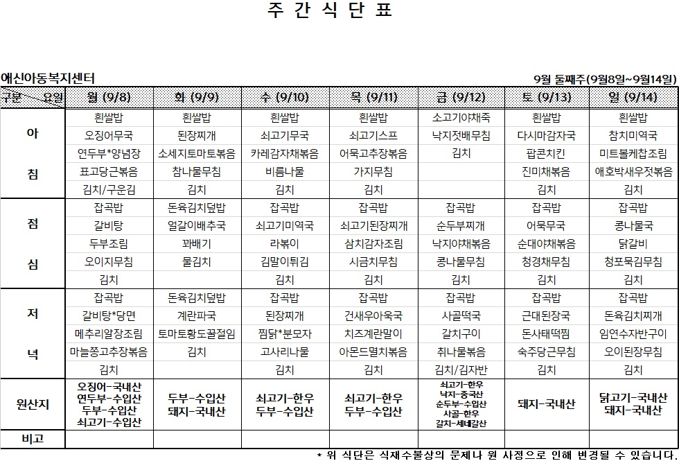 | 2025년 9월 첫째주 주간식단표 (0) | 2025.08.31 |