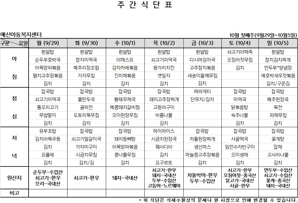 | 2025년 10월 둘째주 주간식단표 (0) | 2025.10.09 |