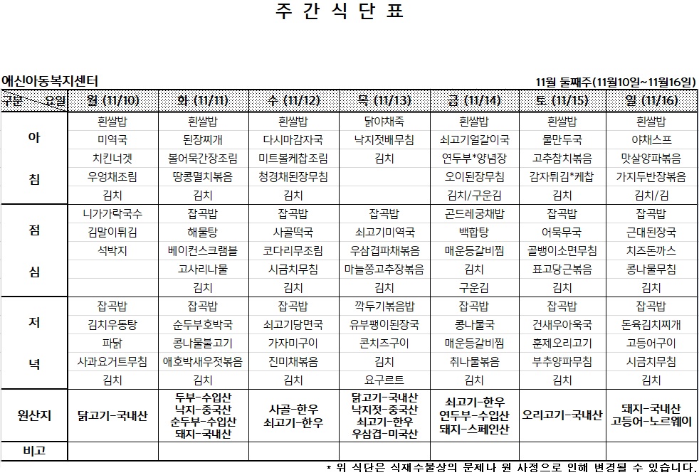| 2025년 11월 첫째주 주간식단표 (0) | 2025.11.02 |