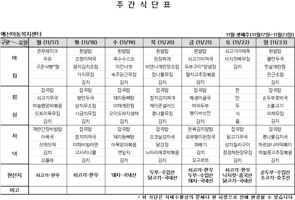 | 2025년 11월 둘째주 주간식단표 (0) | 2025.11.10 |