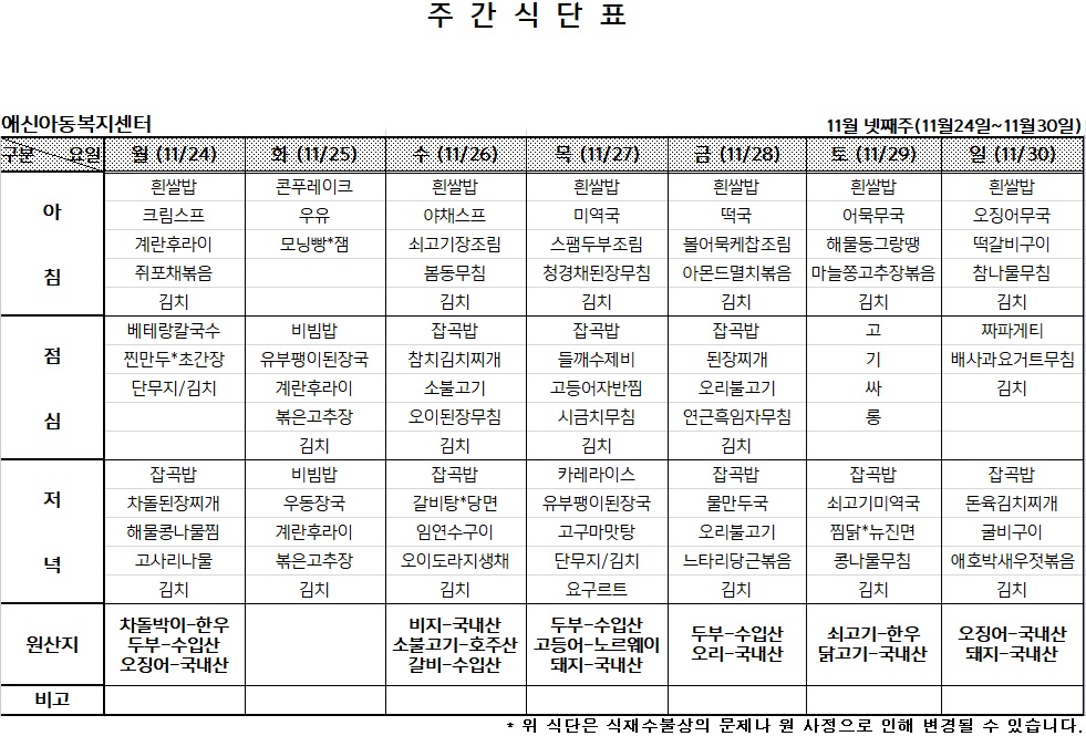 | 2025년 11월 둘째주 주간식단표 (0) | 2025.11.10 |
