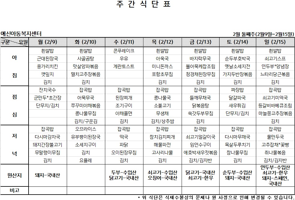 2026년 2월 둘째주 주간식단표