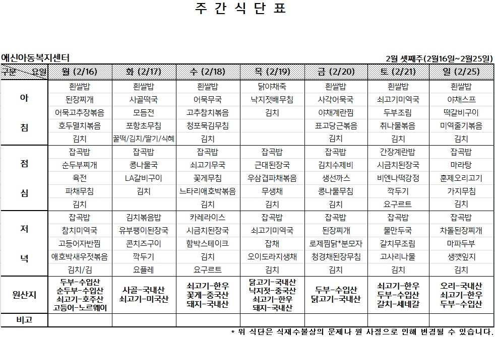 2026년 2월 셋째주 주간식단표