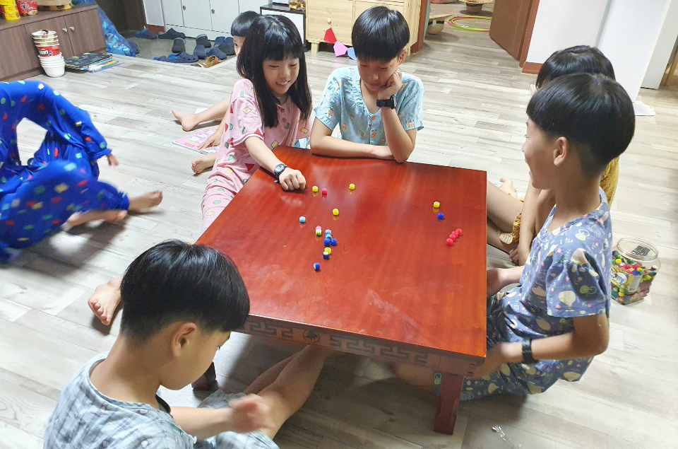 집에선 옹기종기모여 공기대결도 하고, 알까기도 했어요~