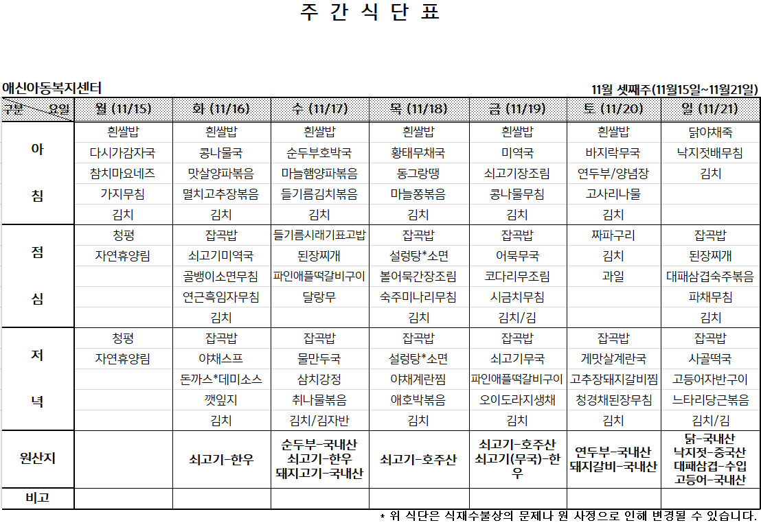 | 11월 첫째 주 주간식단표 (0) | 2021.11.02 |