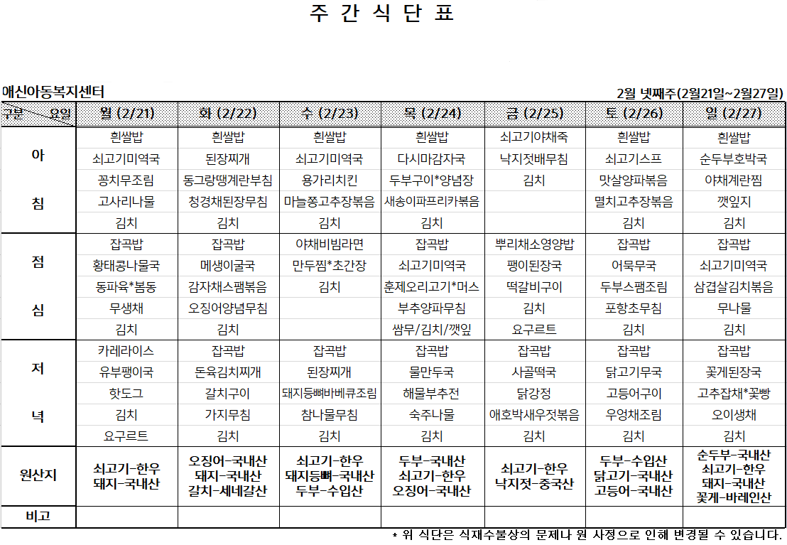 | 2022년 2월 둘째주 주간식단표 (0) | 2022.02.04 |
