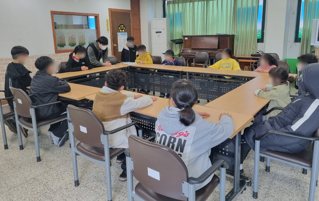 주말, 강당에서 미취학과 초등부 대상,