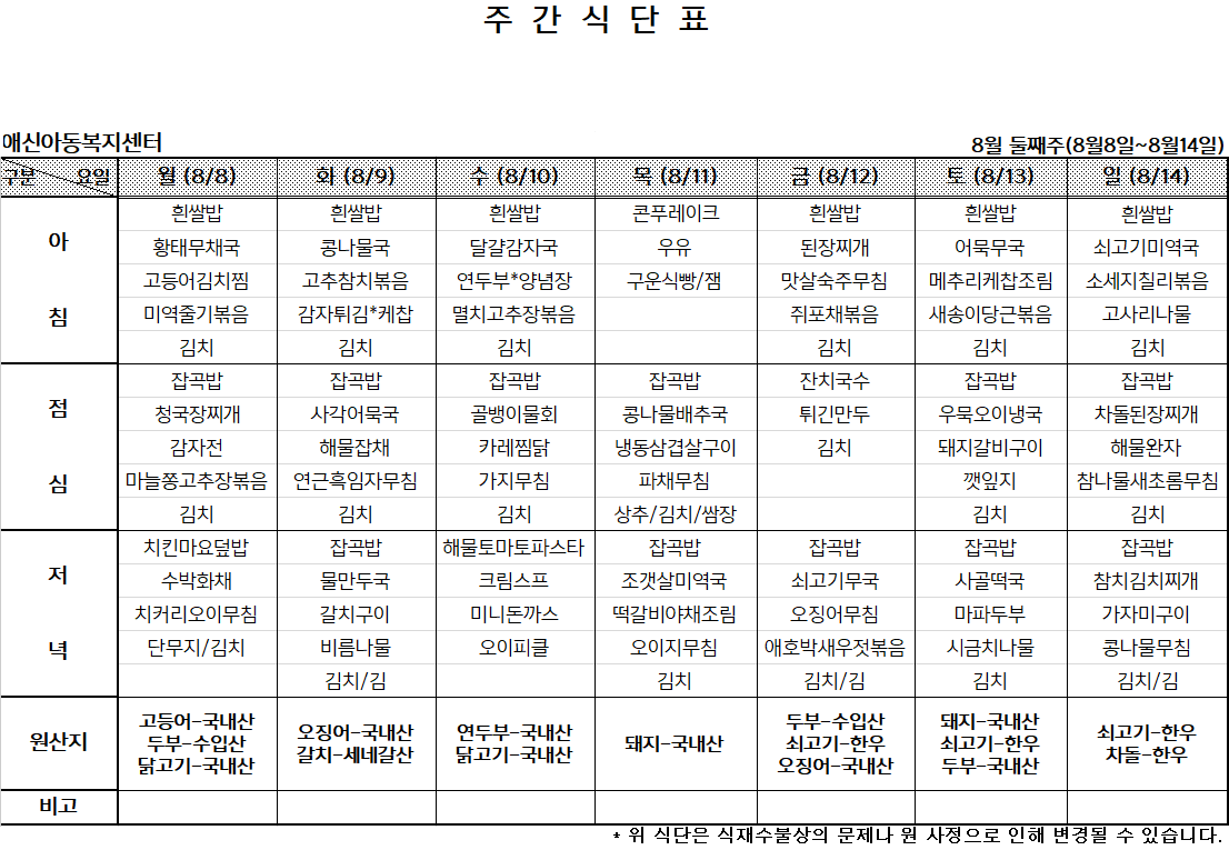 | 2022년 8월 첫째주 주간식단표 (0) | 2022.07.27 |
