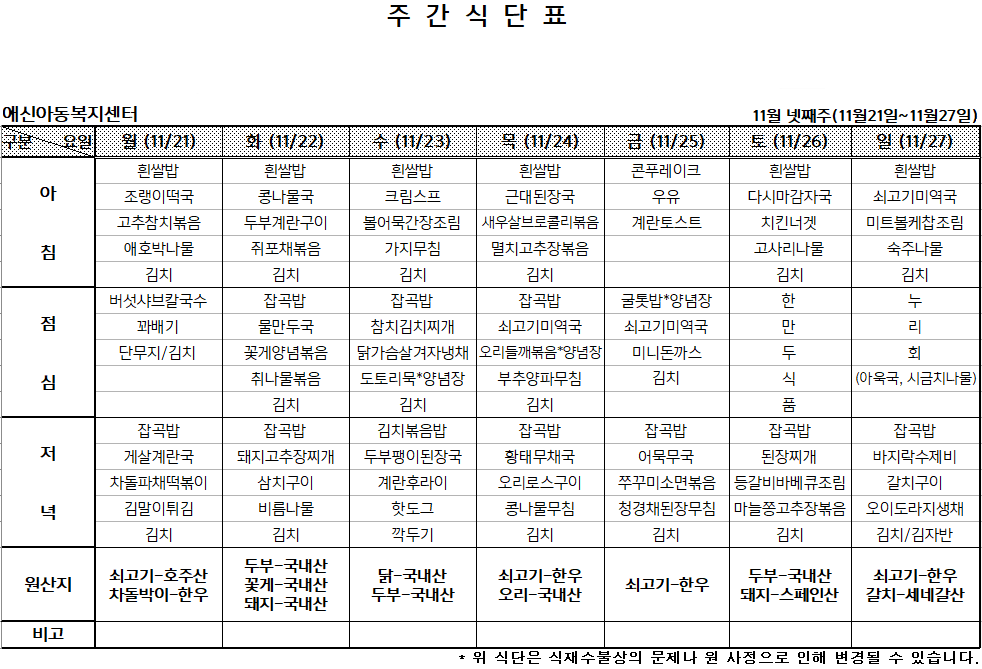 | 2022년 11월 첫째주 주간식단표 (0) | 2022.10.27 |