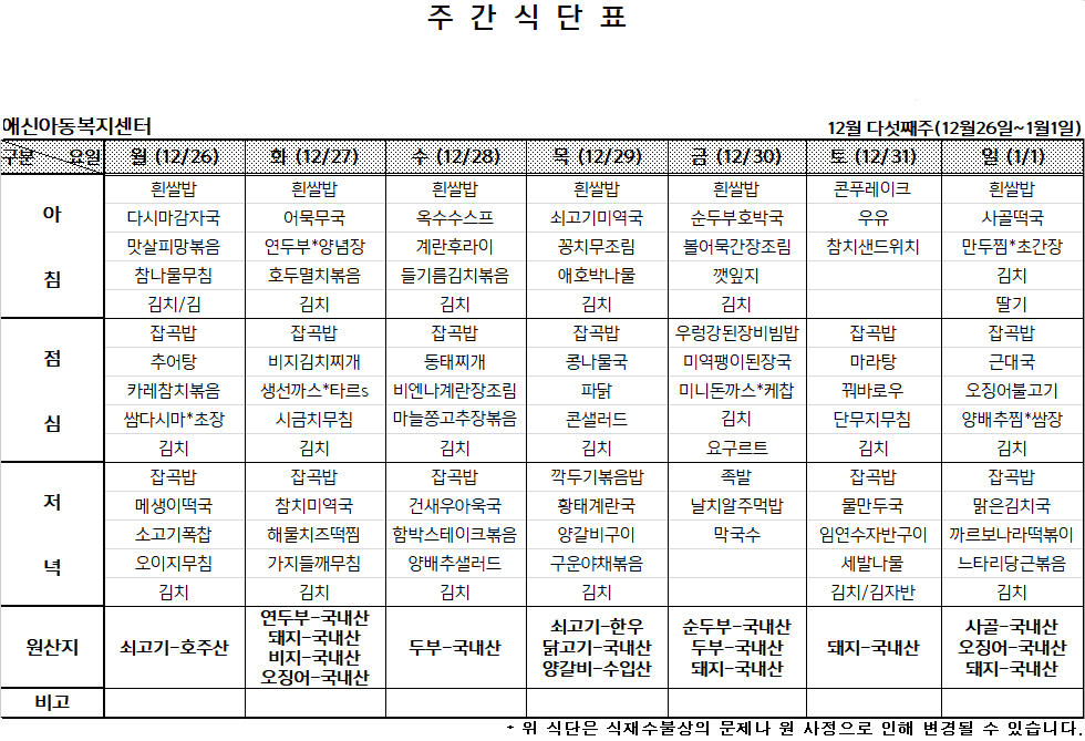 | 2022년 12월 넷째주 주간식단표 (0) | 2022.12.18 |