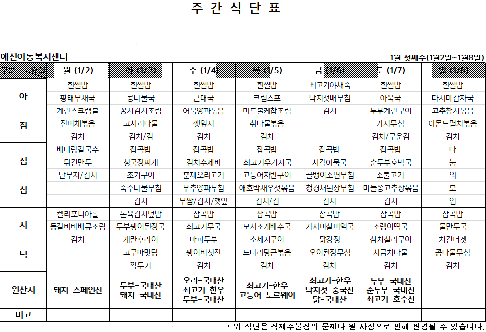| 2023년 1월 둘째주 주간식단표 (0) | 2023.01.08 |