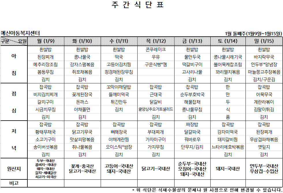 2023년 1월 둘째주 주간식단표